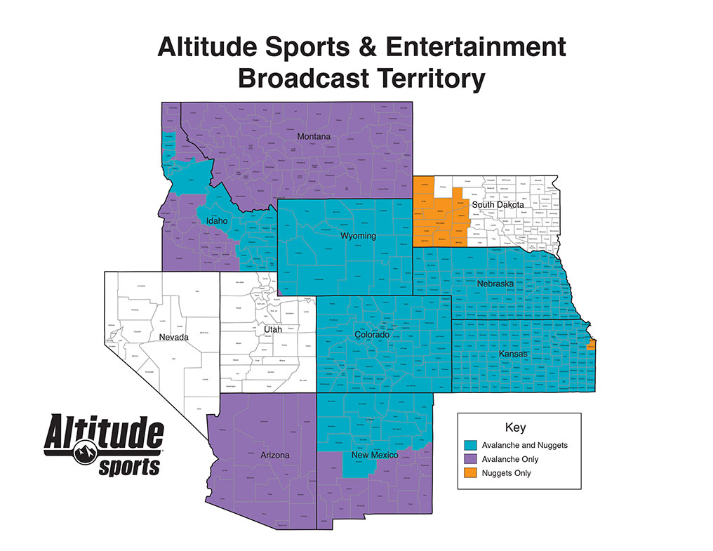Altitude is available in a 9-state region that includes all or parts of: Colorado, Arizona, Idaho, Kansas, Montana, Nebraska, New Mexico, Southwest South Dakota (Rapids City-DMA) and Wyoming. Due to NBA and NHL restrictions, some areas are not eligible to receive either Nuggets or Avalanche game broadcasts. When an area is restricted, it is noted in the "Restrictions" field of your zip code search. TV Subscribers located outside of Altitude's 9-state region will not receive Nuggets or Avalanche broadcasts with Altitude's regular programming. For more information, please contact Altitude's Affiliate Sales department affiliatesales@altitude.tv.